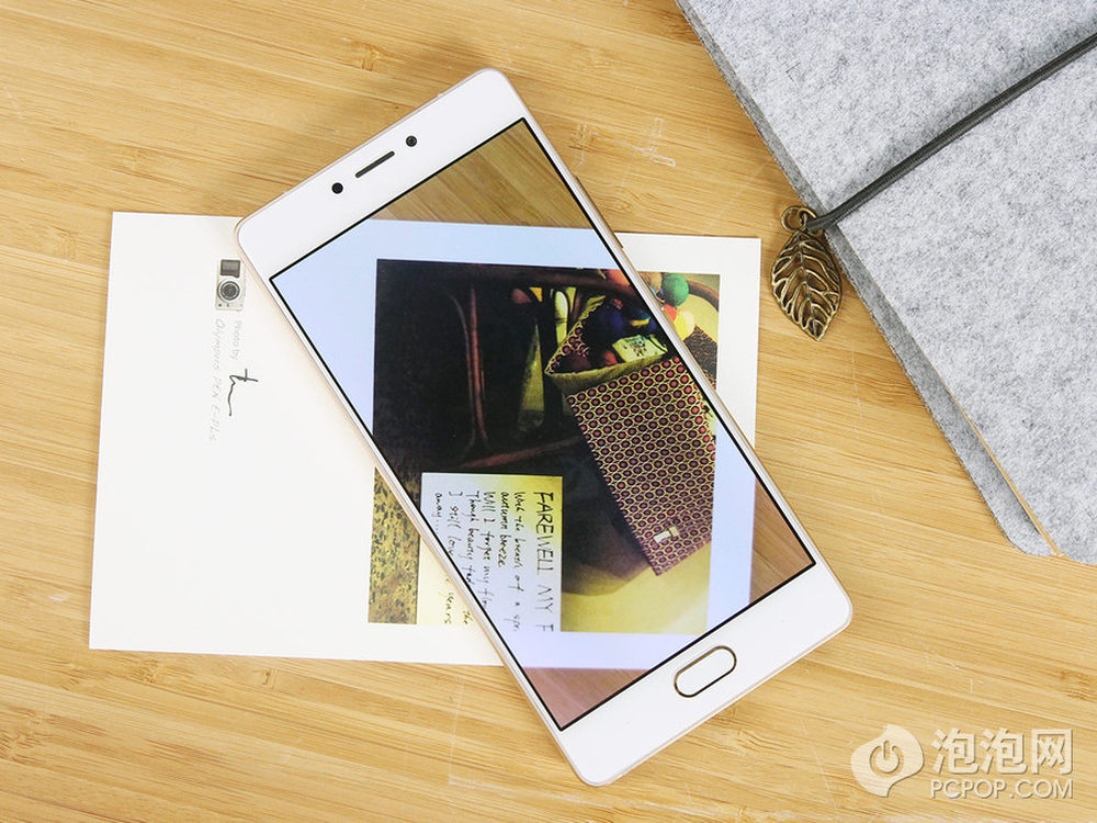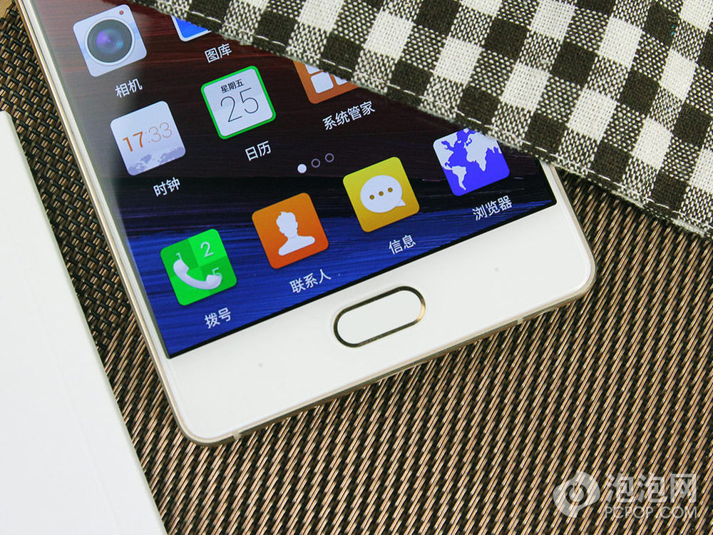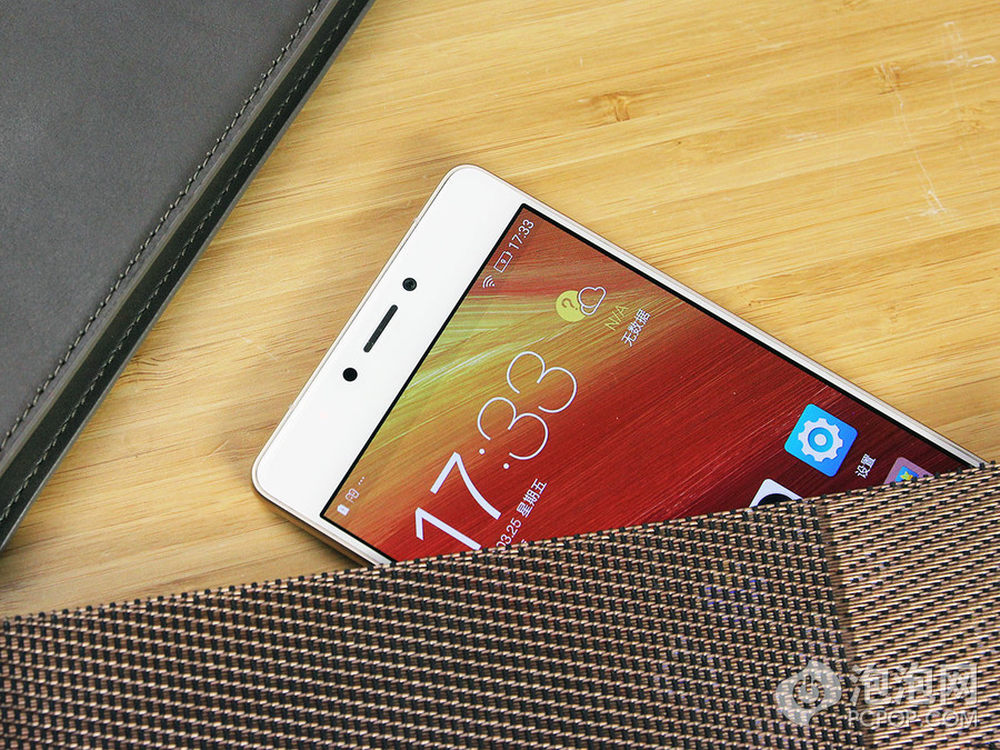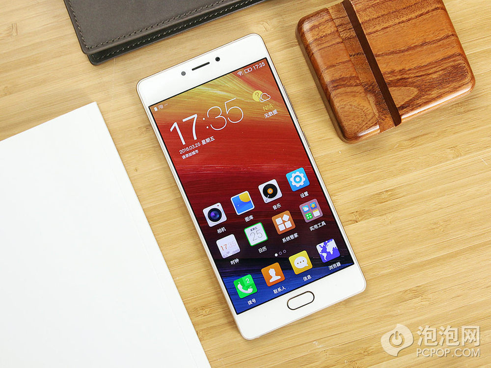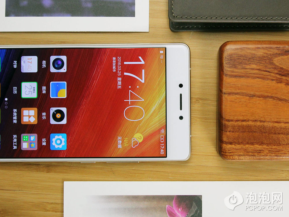 回到手机正面,可以看到S8的前面板采用了时下热门的2.5D玻璃,边缘弧度自然细腻,而尽管并未激进的采用“无边框”设计,但金立S8由于采用了一块超窄边框的三星AMOLED屏幕,边框宽度已经到了极窄的地步,再加上紧凑的机身以及切割的恰到好处的边框,在握感上你很难相信金立S8是一款5.5英寸屏幕的手机。4/13