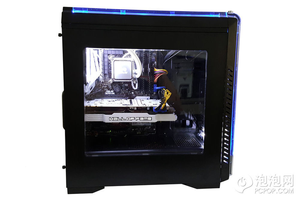 最后炫一下整体效果,黑白配色是不是非常耐看?创客TX10机箱的侧面还自带了两条蓝色的LED灯带,点亮之后科技感十足。