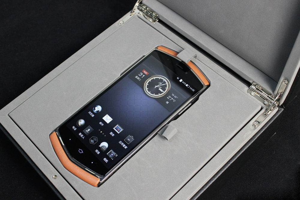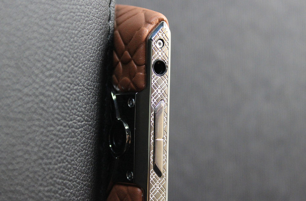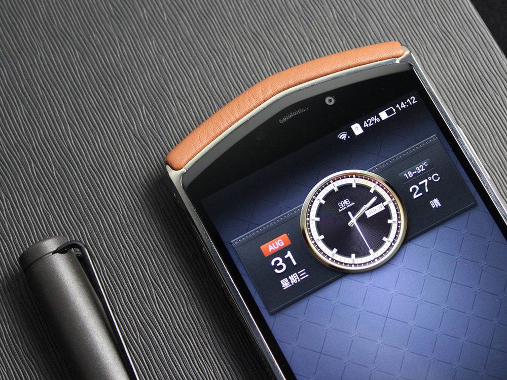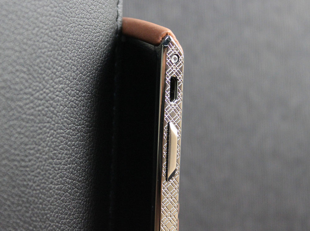 M3风尚款采用压纹处理的浅棕色头层小牛皮,配以亮银色钛金部件,清新优雅,尽显奢华手机典型的外观;正面覆盖着康宁大猩猩曲面玻璃,玻璃上下边都有曲面的打磨,看起来很有质感。