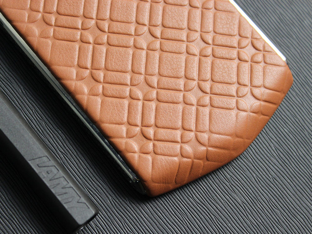 机身的背部采用浅棕色头层小牛皮包裹,中间是设计非常巧妙的以"时间"为主题,酷似高级腕表表盘的圆形SIM卡座设计,为手机嵌入更具内涵的经典与传承之意,赋予手机易于识别的尊贵性,彰显身份与品位。10/16