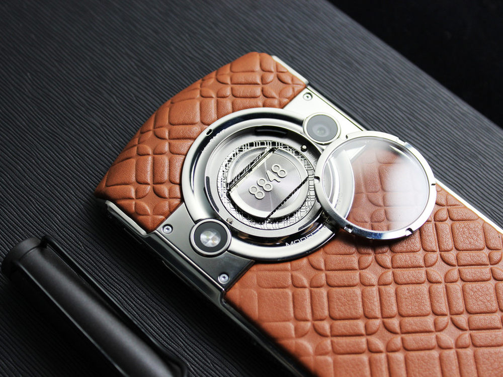 机身的背部采用浅棕色头层小牛皮包裹,中间是设计非常巧妙的以"时间"为主题,酷似高级腕表表盘的圆形SIM卡座设计,为手机嵌入更具内涵的经典与传承之意,赋予手机易于识别的尊贵性,彰显身份与品位。8/16