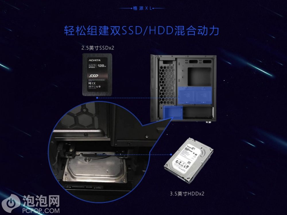 在鑫谷各派XL机箱的侧背面,有两个壁挂式的2.5英寸硬盘位和能够容纳两个3.5英寸硬盘的存储仓,一举解决了快速读写和大容量存储的问题。7/22