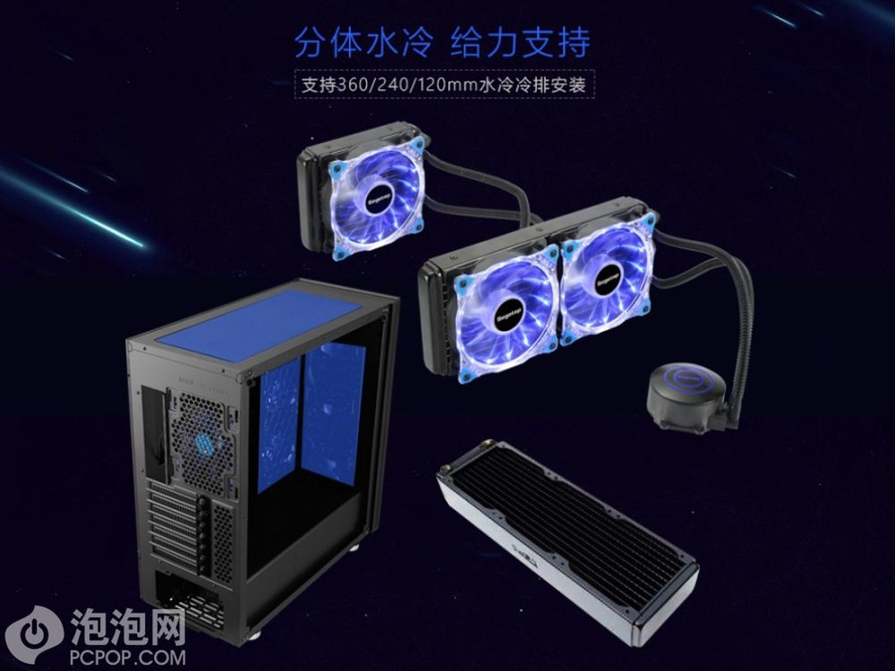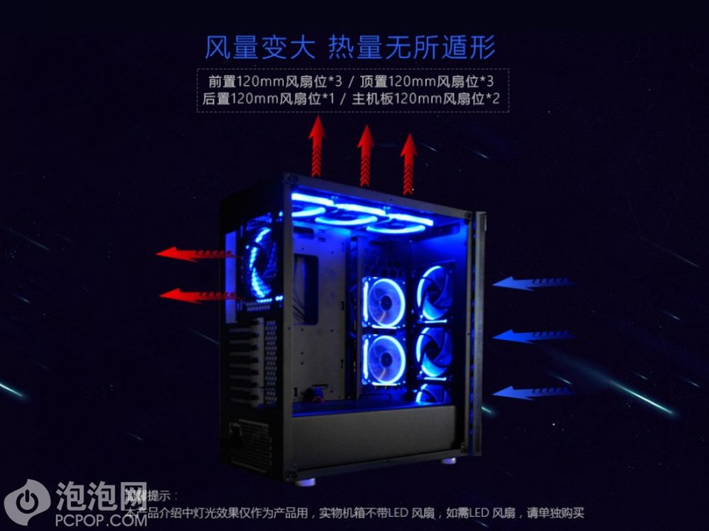 强大的性能输出需要同样强大的散热能力来辅佐,鑫谷格派XL前、顶各置3个120mm风扇位,侧正面可安装两个120mm风扇,同时也有一个120mm的后置风扇位。8/22
