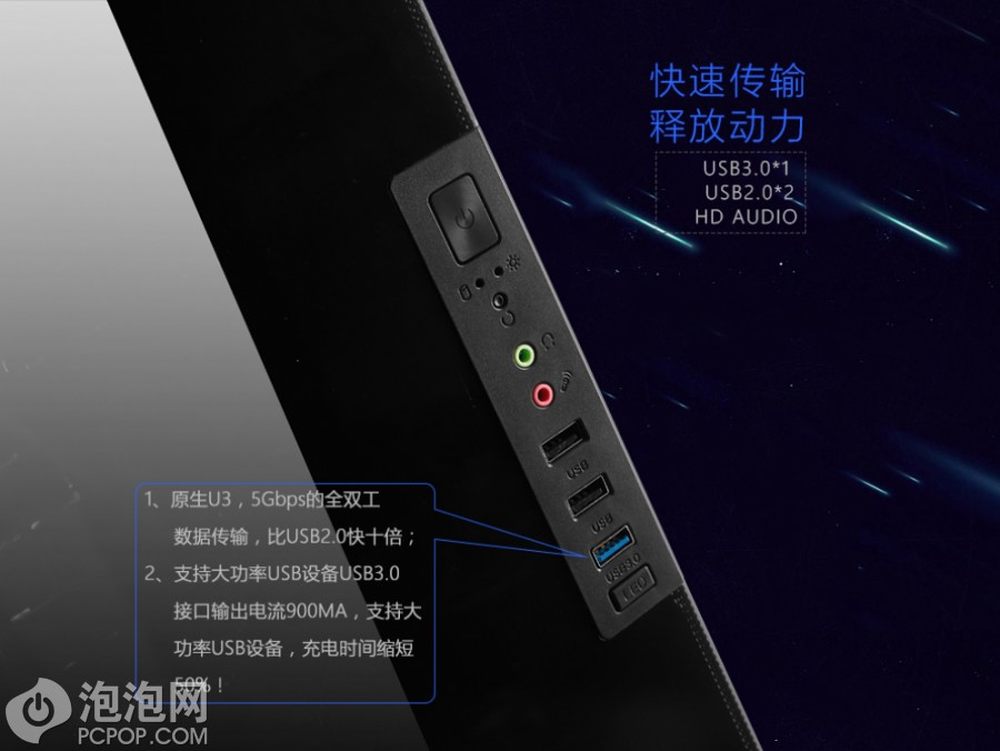 前面板上的I/O接口,提供了两个USB 2.0和一个 USB 3.0以及一组两个3.5mm的音频接口。10/22