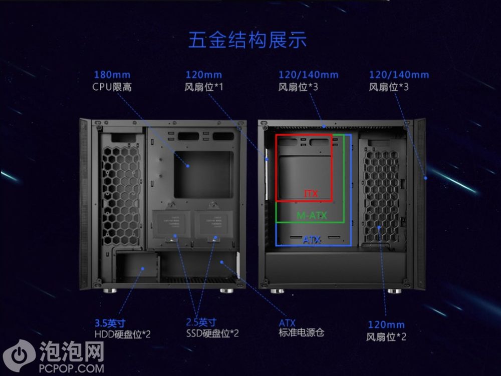 作为一款电竞中塔式机箱,鑫谷各派XL能够兼容从ATX到ITX规格的主板。CPU散热器的高度能够支持到180mm,显卡最长可以到420mm,即便使用了冷排也能有280mm的空间,兼容性强大。6/22