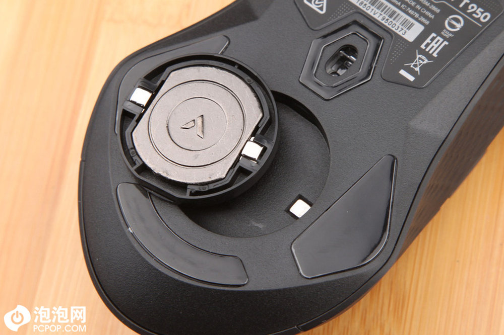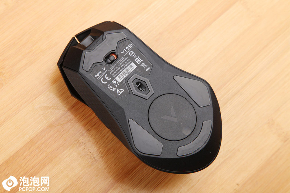 VT950鼠标底部的脚垫数量是十分良心的,大大小小一共五块,引擎视窗的那一圈也是脚垫,五块脚垫分布于整个鼠标地面,保证用户在使用过程中随时保持鼠标的顺滑。在最上面一块脚垫的下方是鼠标的开关,用户可以手动开启或关闭鼠标,以节省电量。5/12