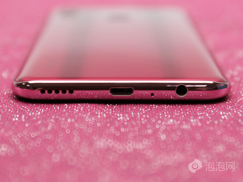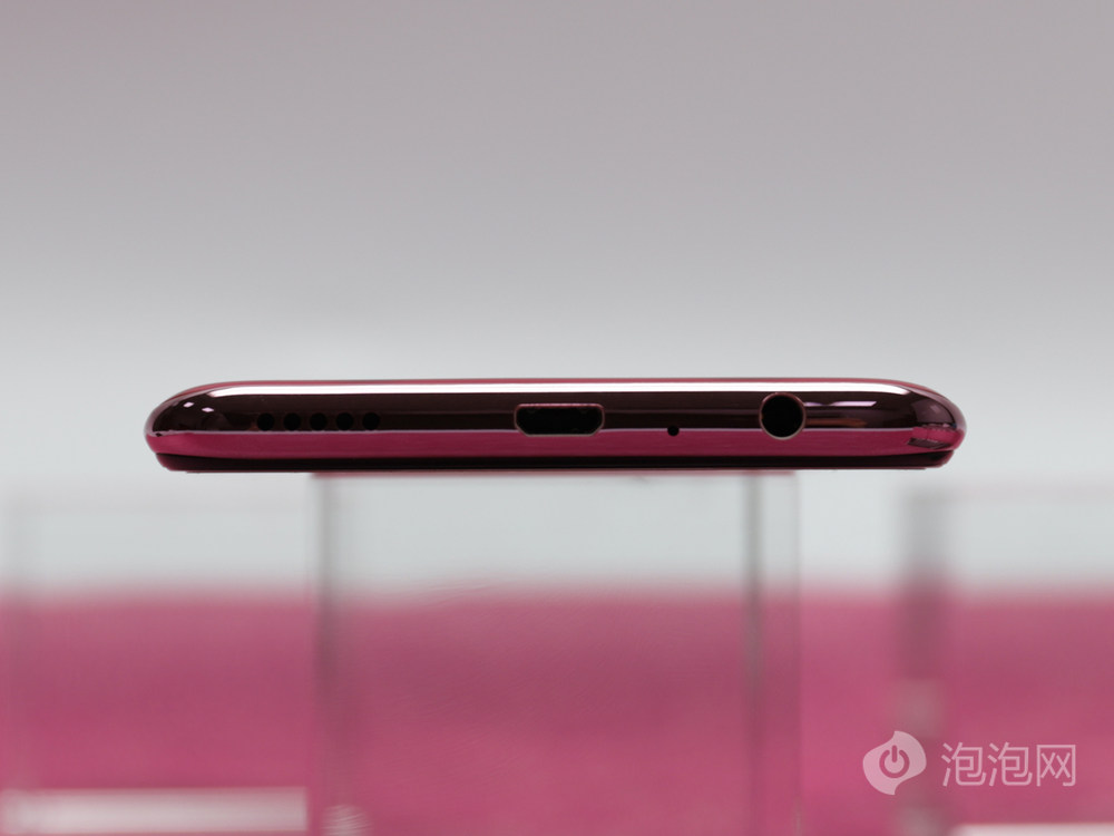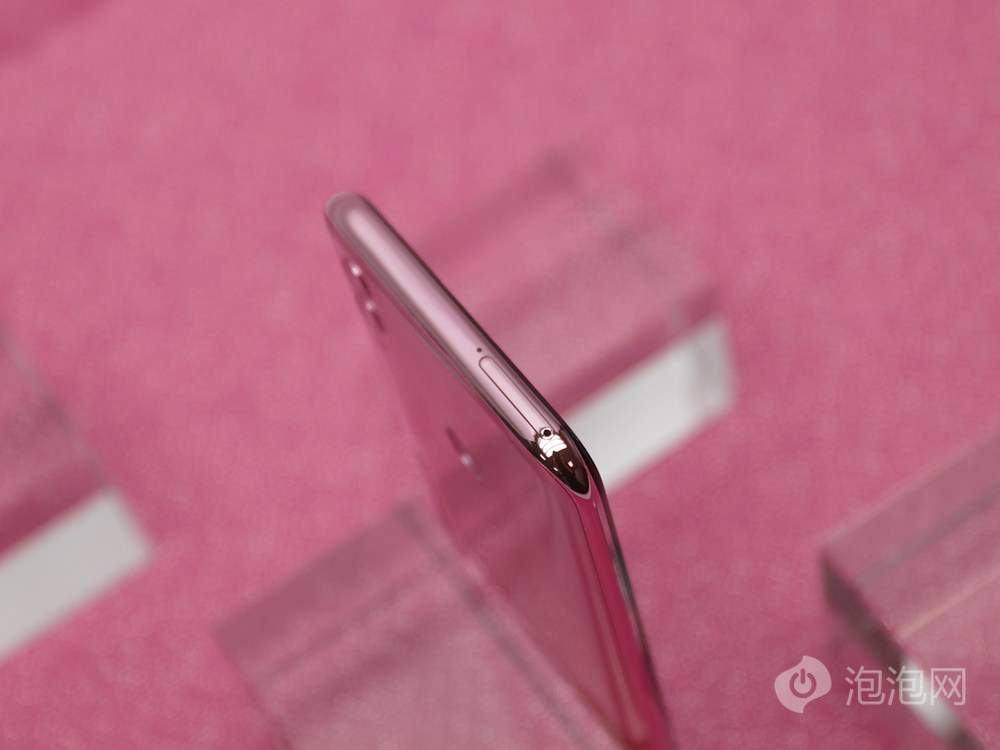 手机中框是浅粉色,SIM卡卡槽在机身顶部。9/10