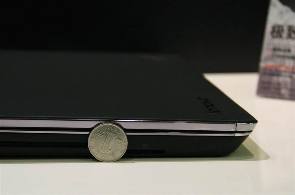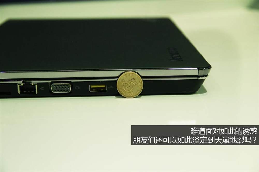 说到轻薄,现在就让我们立马来对比一下吧!我们可以看到,在合起来的状态下,ThinkPad E220s的整机厚度基本等于5毛钱硬币的直径,其轻薄可想而知毋需赘言!