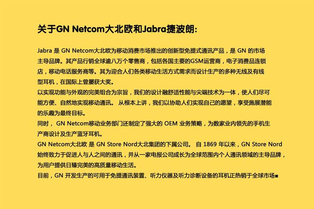 大北欧移动事业部副总裁Anne Raaen Rasmussen及移动事业部总经理Viggo Olsen出席了本次发布会,Anne为大家介绍了大北欧集团的概况,Jabra捷波朗亚太区移动通讯业务营销执行总监汤中强先生为大家带来了Jabra全新行动耳机解决方案。与会的媒体与嘉宾率先体验了Jabra捷波朗最新行动通讯耳机的各项功能及领略了这优秀设计的风采。30/33
