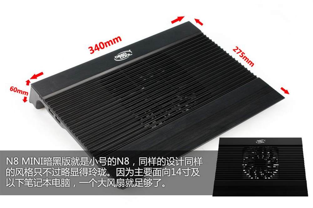 普通版N8尺寸较大适合14寸尤其是15寸笔记本电脑,能完全覆盖大尺寸笔记本底部风量也很大,MINI版尺寸和风扇都有一定缩减,因此在14寸笔记本上稍显力不从心。不过无论是外观还是性能上对于14寸以下尤其是13.3寸笔记本更搭配。而现在14寸以下尺寸的产品正在逐渐取代沉重庞大的笔记本成为主流,N8 MINI暗黑版也算是一种非常主流的选择。