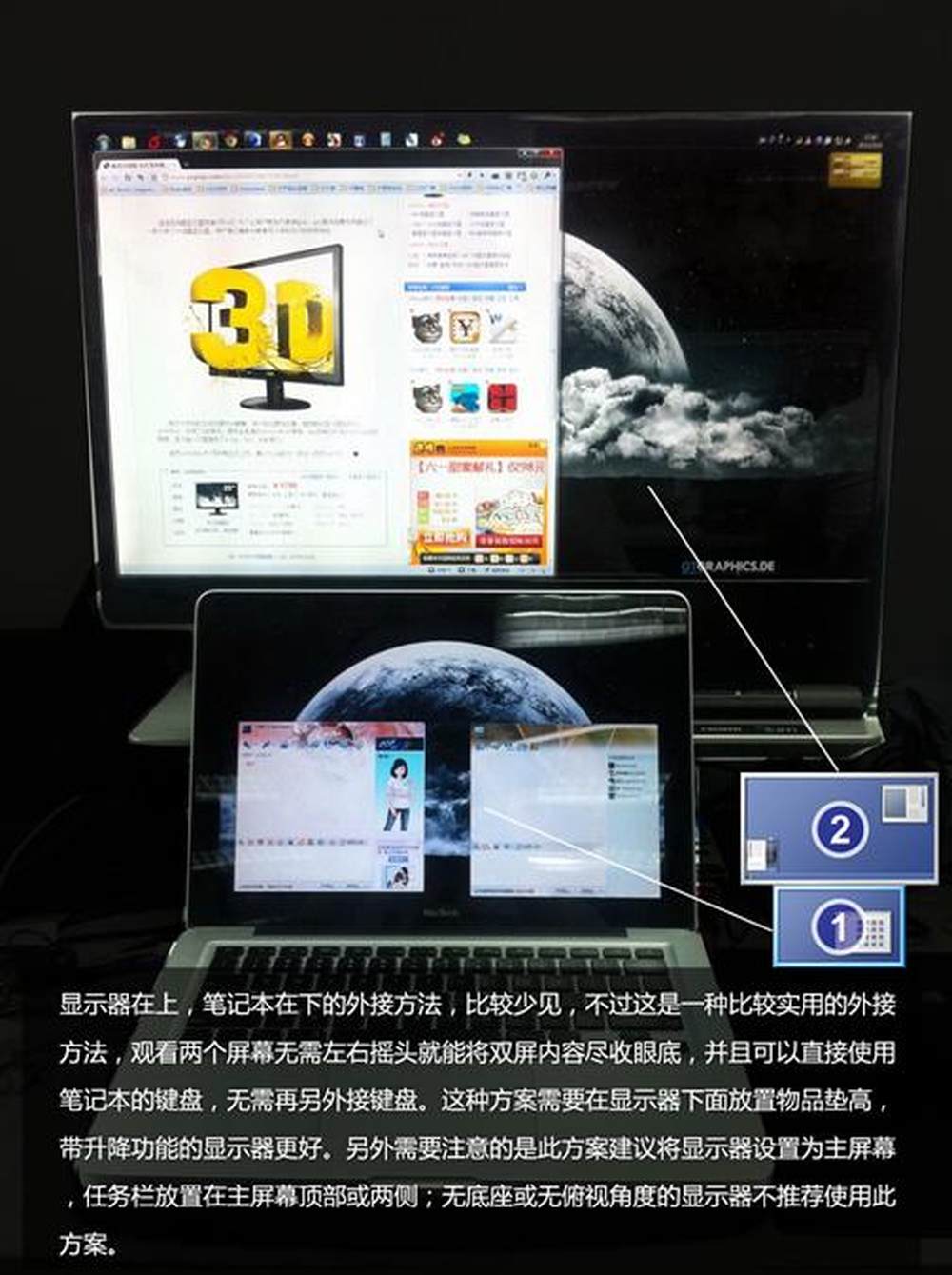 笔记本外接显示器要使用双屏时,切记使用扩展模式。建议在系统分辨率设置中进行调节,笔记本内置快捷切换键不是100%%成功。2/8