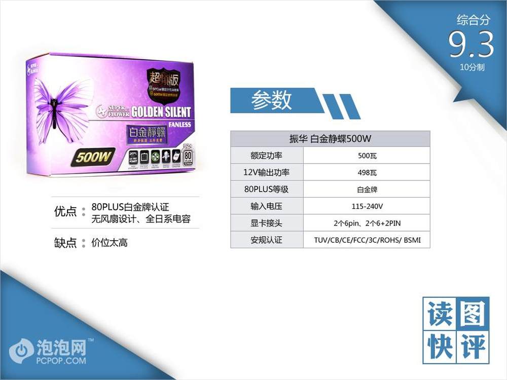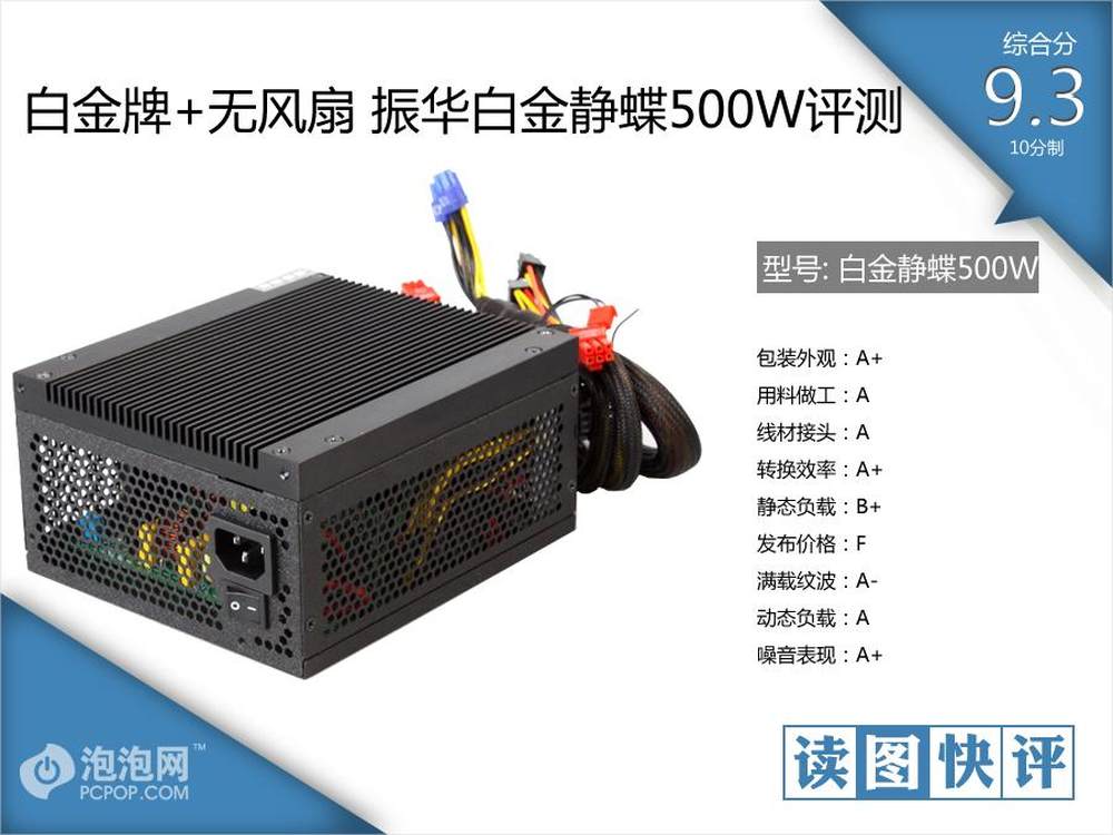我们曾经见过不少无风扇电源,在80PLUS金牌效率没有出现时,无风扇电源无一例外拥有超高返修率,不过现在情况不同了,有几个厂商推出了超高转换效率无风扇电源:海韵的X系列,全汉的Aurum系列,还有我们今天看到的振华白金牌无风扇电源,如果说这颗电源有什么需要改进的,我认为可以考虑把内部元件重新排布下,给正面留出更多的散热空间。最后补充一下,我认为这将是一颗故障率很低的无风扇电源。我们之后会用一套高端平台拉跑一跑这个电源,为大家展示一个无风扇白金牌的威力。感兴趣的网友可以继续关注泡泡网机箱电源频道。4/10