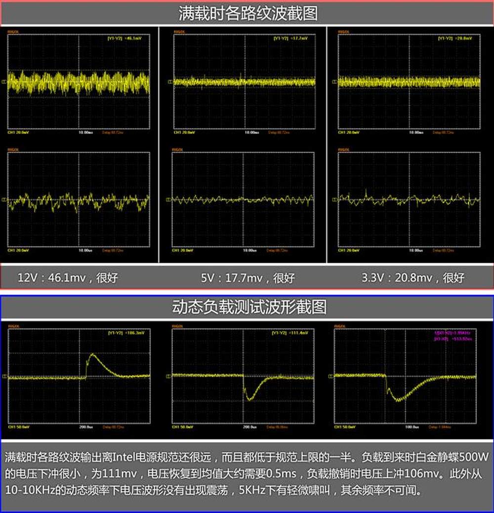 同是振华开发的LLC芯片,冰山静蝶系列在动态下的表现就比超频三Z9要好很多,负载变化造成的电压波动只有一次,电压上冲下冲幅度小,电压恢复到均值的时间短,半桥的LLC结构振华调整得很好。3/10