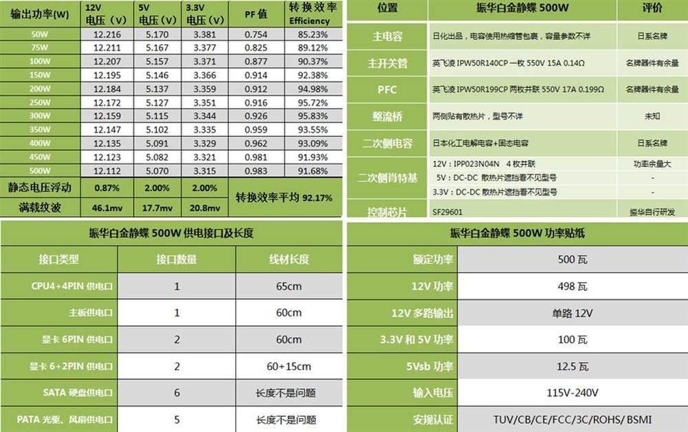 之前没有放出电源的铭牌部分,主要参数都在图片表格内,电源额定功率500瓦,单路12V输出498瓦,占99.6%%。在静态测试中转换效率最高为95.83%%这是一个让人惊讶的成绩,到现在为止转换效率最高的10颗电源有5颗来自振华,转换效率最高的5颗电源有4颗来自振华。