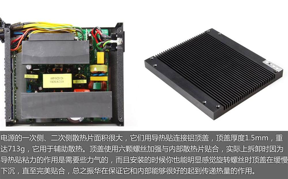 这块铝盖是电源内外连接的桥梁,透过机箱风道可以辅助电源散热,实际摸上去时,在室温20多度的环境下很清凉,对散热还是有很大帮助作用的。8/10