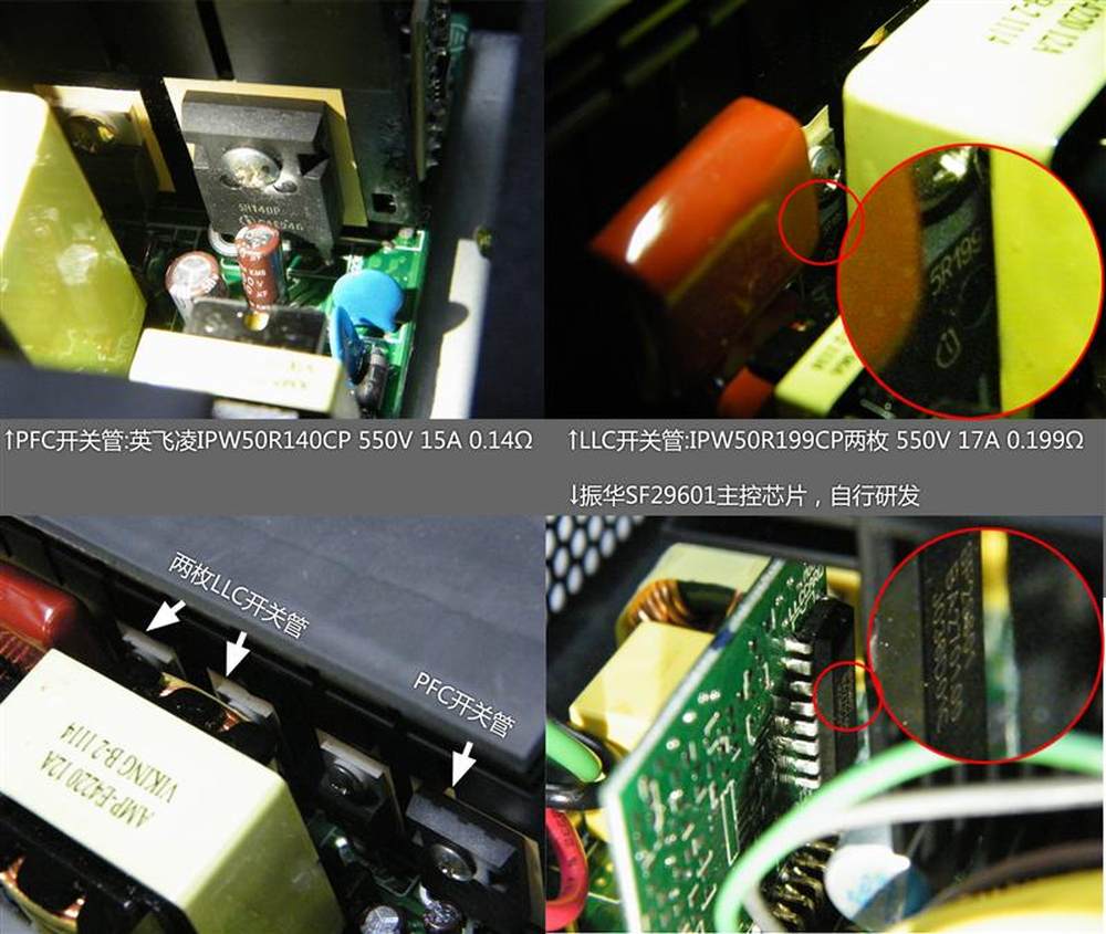 在白金静蝶内部可以看到大量“振华特色”,很多元件都比较特殊,比如自日本川铁专门开模的PFC电感、日化专门为振华开模的8mm直径3300uF二次侧电解电容还可以看到那颗自行研发的SF29601控制芯片。9/10