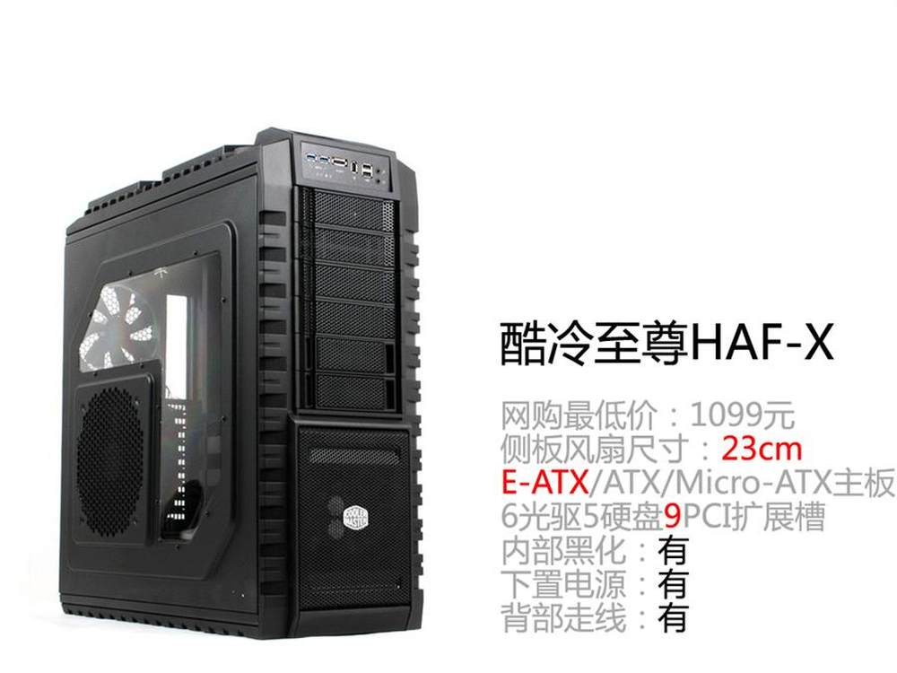 酷冷的高端HAF系列,超强散热配置、外置热插拔硬盘位、内置显卡导风罩、9PCI位,机箱很彪悍就是了。4/8