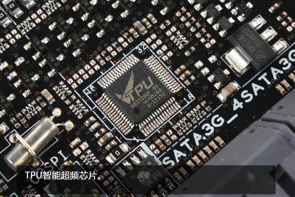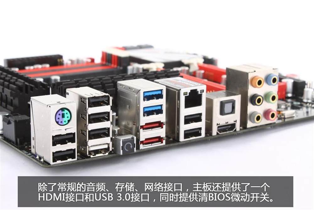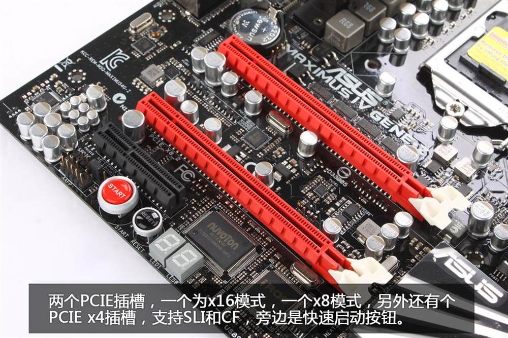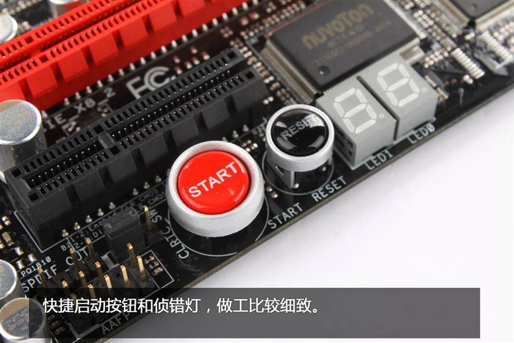 一共有三个PCIE查插槽,前两个红色的一个是x16模式,一个是x8模式,另外还有个PCIE x4插槽,支持SLI和CF,旁边是快速启动按钮。4/19