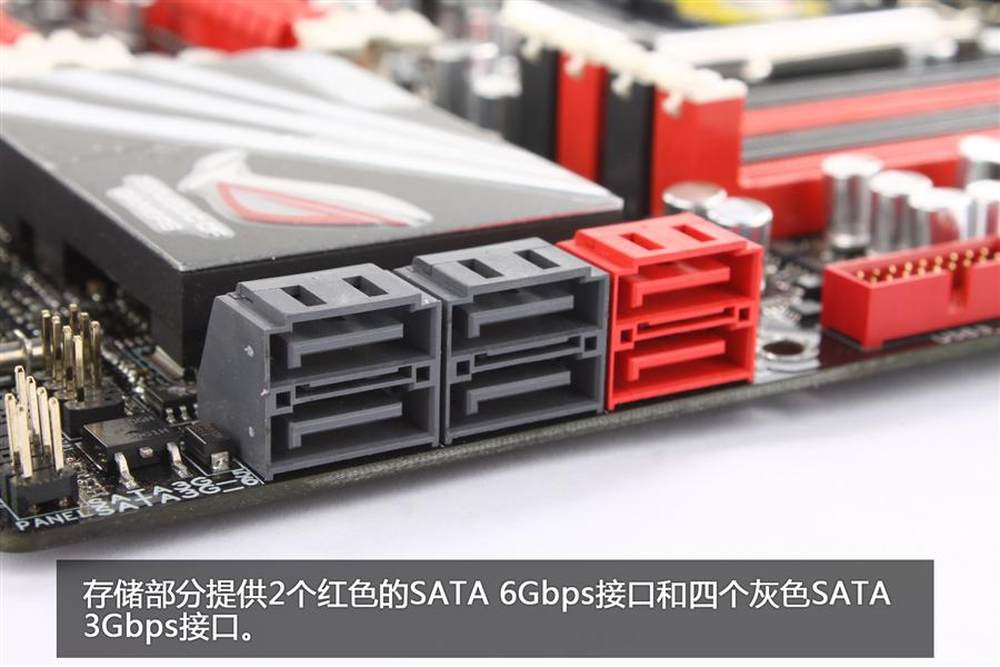 两个红色SATA 6Gbps接口和四个灰色SATA 3Gbps接口。6/19