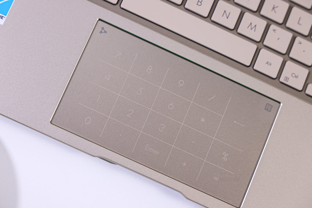 值得一提的是,这款轻薄本用虚拟数字键盘弥补了小尺寸笔记本没有数字小键盘的遗憾。通过轻触华硕灵耀14 2023 旗舰版触控板右上角的图标,可以唤醒虚拟数字键盘。轻触触控板左上角的图标可以调节虚拟数字键盘的灯效亮度。14/25
