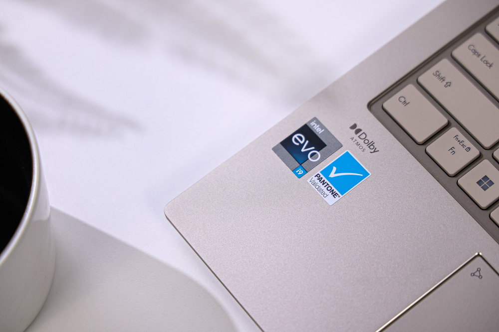 左侧掌托上面的贴纸。说明这款轻薄本通过了英特尔Evo平台认证。15/25
