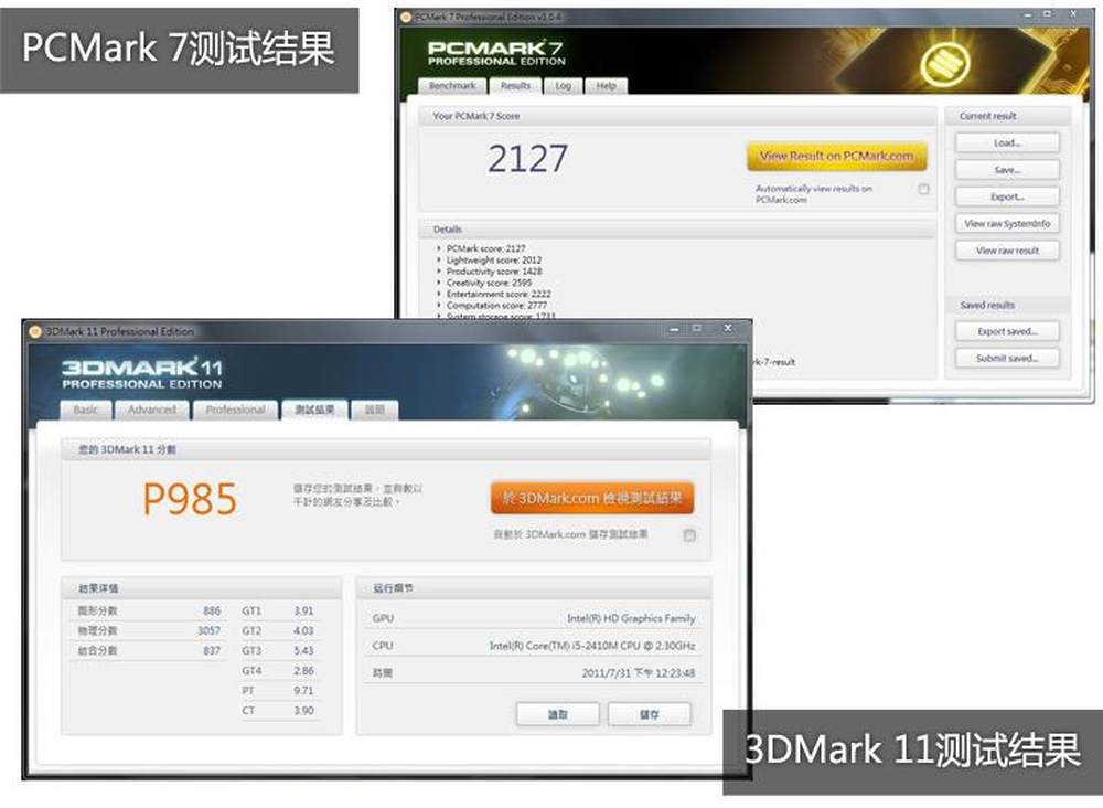 虽然华硕U46SV定位轻薄系列,且具备令人称赞的超长续航,但在PCMark 7以及3DMark 11性能的分中依旧表现主流不俗。23/27