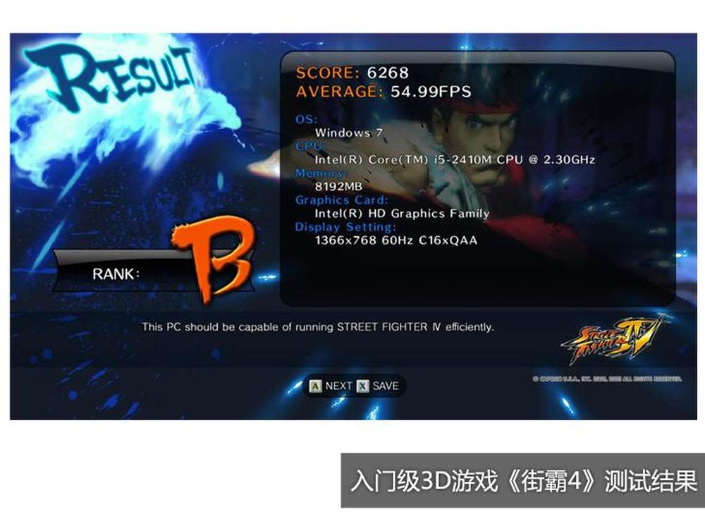 在1366×768分辨率下,华硕U46SV运行入门级《街头霸王4》的得分为6268,帧数为54.99fps,基本可胜任普通中低端3D游戏。25/27
