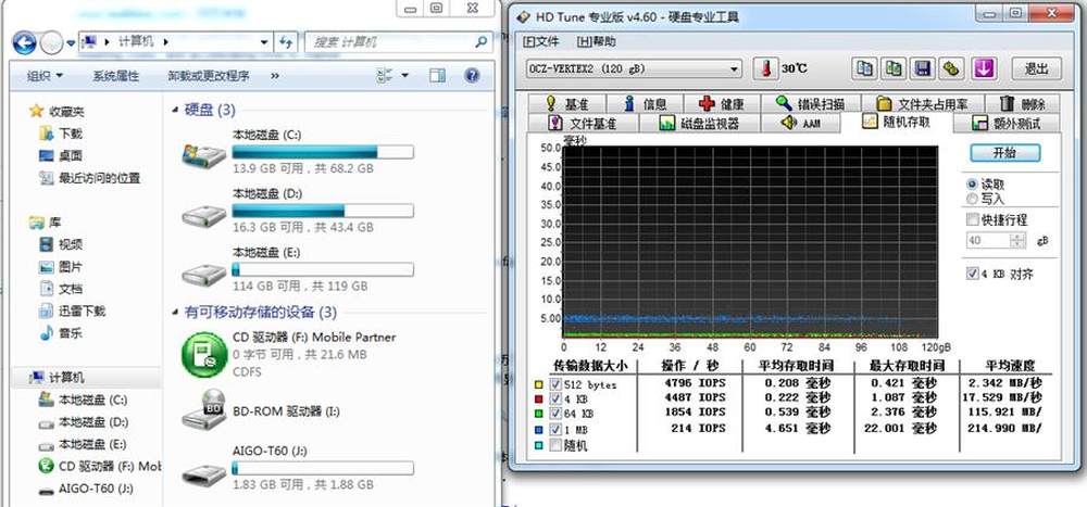 最后象征性的跑了一个测试,因为这个笔记本的主板实在不高端,也不是SATA3的接口,所以完全没有发挥出SSD的巨大优势,比如4KB的读操作Vertex2 120G只有17MB,那个采用indilinx主控的读操作略高,23MB而已。持续传输的速度都在200MB/s以上。