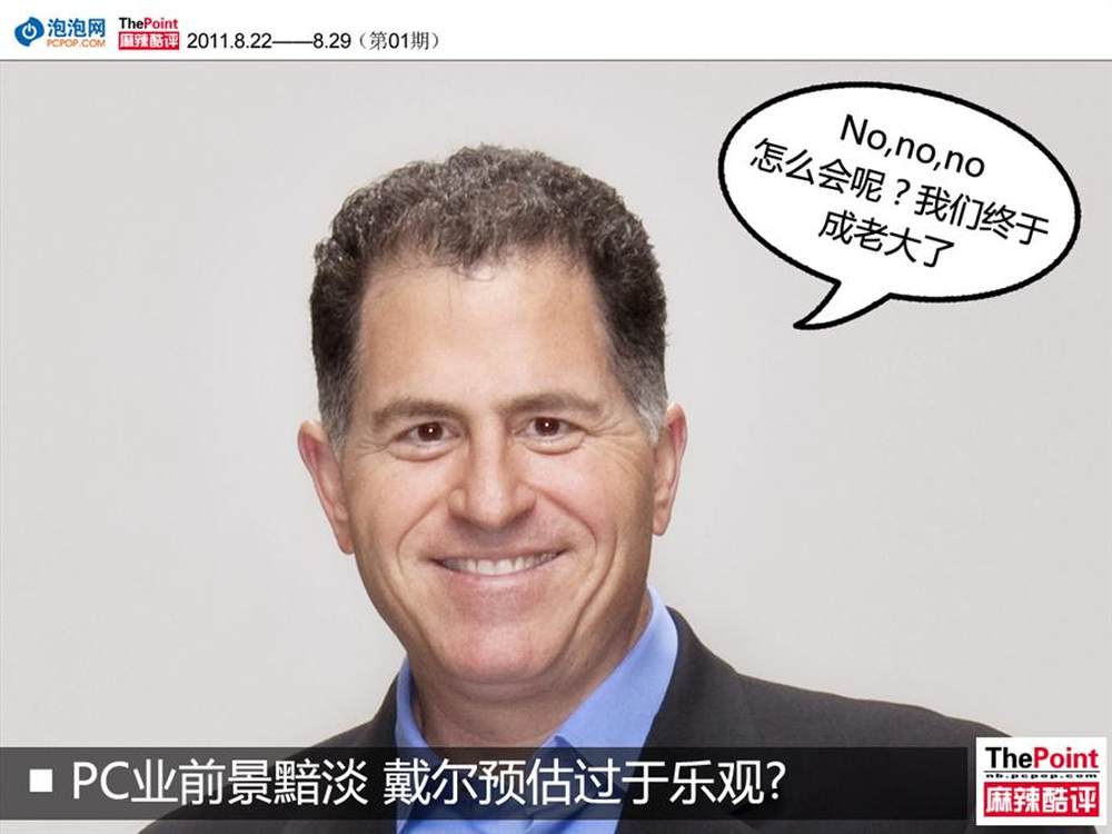 据国外媒体报道,近日戴尔CEO迈克·戴尔在Twitter中发文表示:“传言PC将发展殆尽的说法言过其实,PC业务仍然富有活力。”但同时也有业内人士表示,PC产业前景暗淡,由于未过多涉足智能手机或平板电脑领域,因此戴尔未来或将面临青黄不接的窘迫。7/8