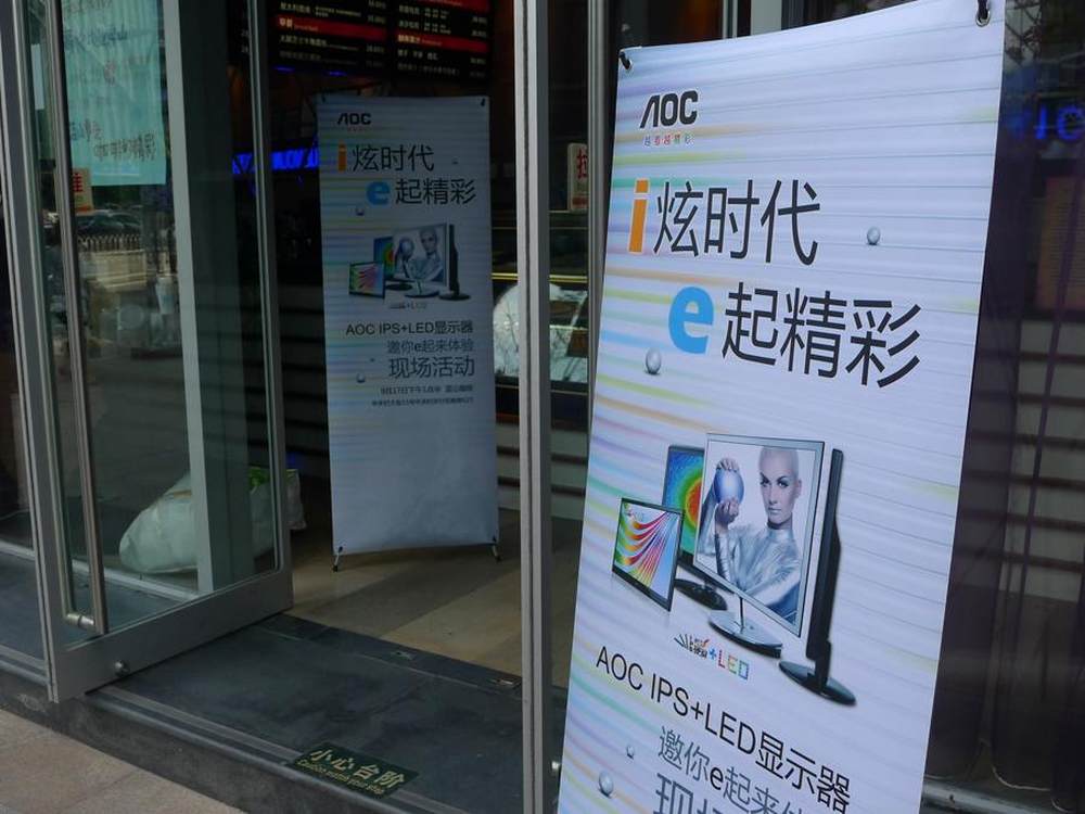 “i炫时代 e起精彩”主题活动的宣传大彩页在店面门口摆放。3/14
