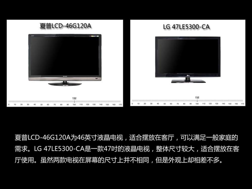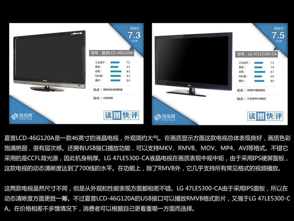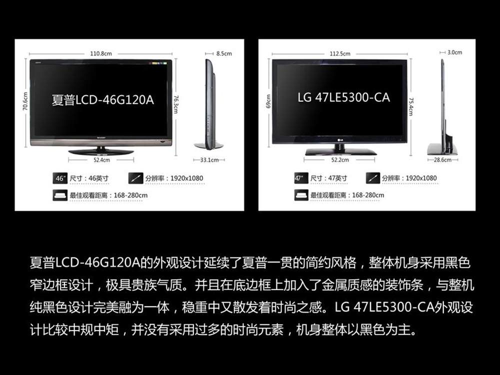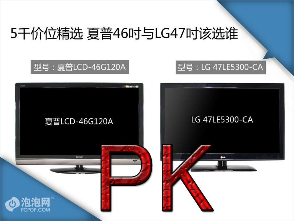 目前在5千元左右价位可选的平板电视越来越多,而且在性能上都相差不多,到底要如何选择呢?是很多消费者都比较关注的问题,这里挑选了两款5千元左右价位的具有非常不错性价比的夏普LCD-46G120A和LG 47LE5300-CA进行对比PK,想可以对想在黄金周购买该价位平板电视的朋友带来帮助。2/14