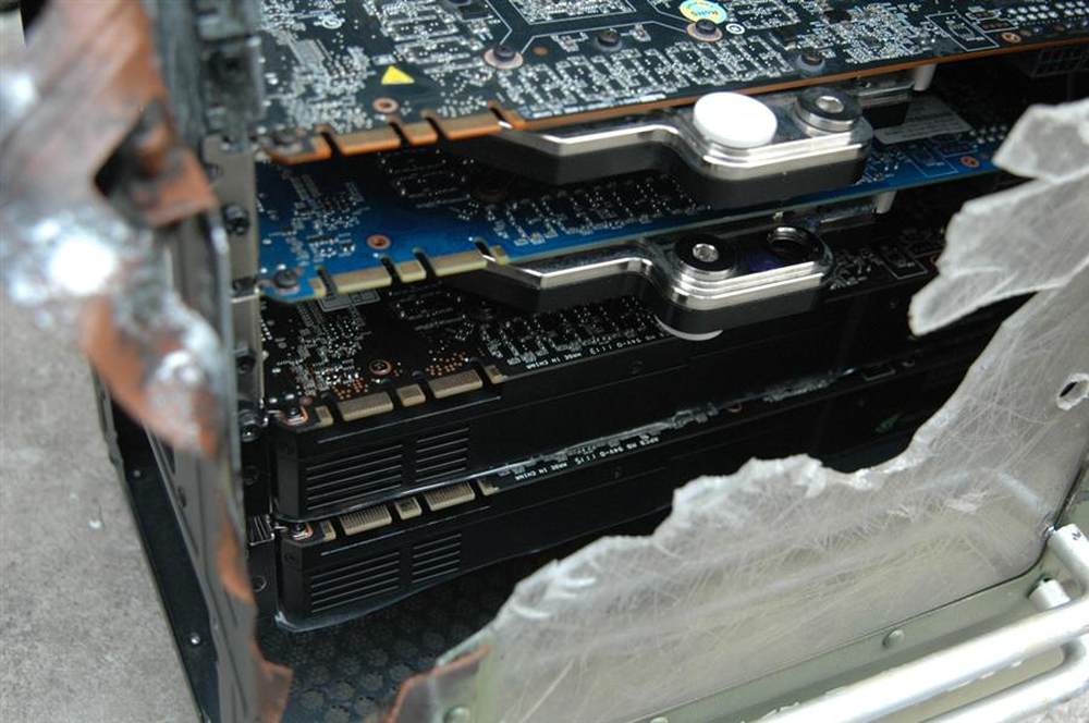 而在机箱内部配置方面,则使用了技嘉 高端G1-Killer系列军工游戏主板,四块Nvidia GTX580显卡SLI 四卡交火, 电源方面为酷冷至尊 龙影1200W 电源,散热以水冷风冷混合的散热方式,以及前面板内部一块LCD液晶显示面板则显示出机器内部温度状况以及机箱内部各风扇调节,整体超高端的配置一同为游戏中的玩家提供强力的后期保障。