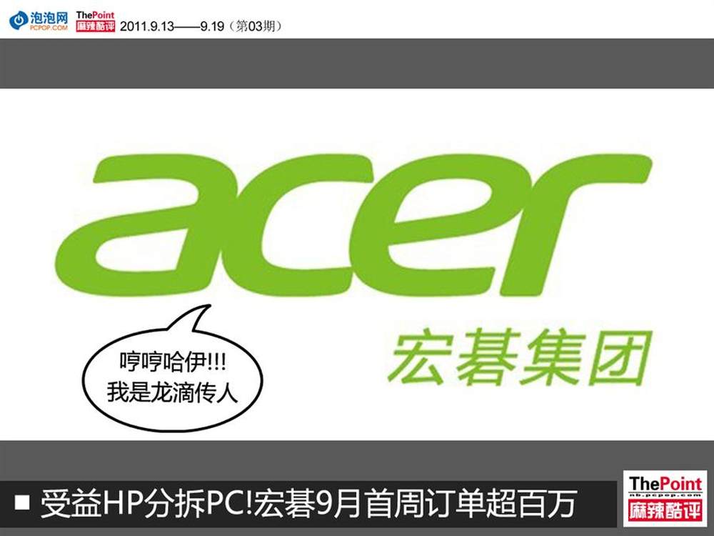 回顾上周业内动态,惠普PC分拆门依旧波及不断,宏碁公司9月首周订单便超百万。但与此同时,面对这块“肥肉”,戴尔似乎更相信自己的实力,表示将“乘机夺取份额”。至于苹果方面,据相关数据表示苹果Mac三季度销量将超过460万台,且目前已成为全球第二位最具价值的全球品牌之一。想必苹果这回真得无奈叹句:“可惜,怎么不是第一呢?”2/8