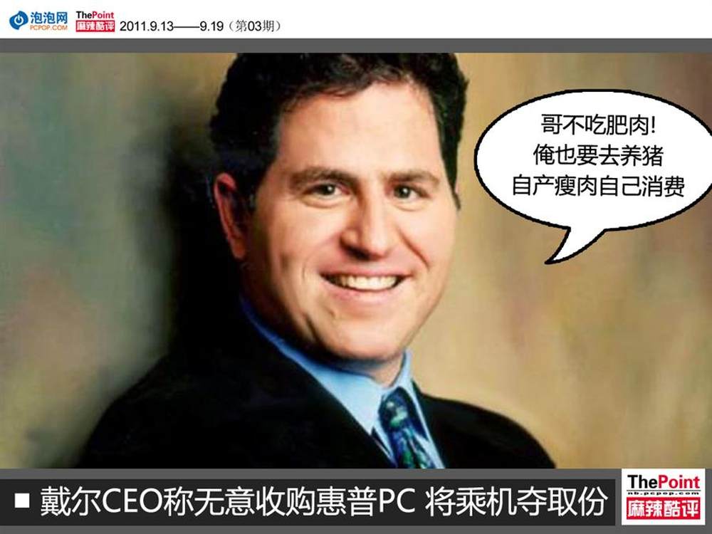 戴尔公司CEO迈克尔·戴尔最近接受采访时说,没有兴趣收购惠普PC业务,由于最大的竞争对手处在大重组中,戴尔准备赢得更多市场份额。上个月,惠普宣布考虑分拆个人电脑业务,砍掉了平板电脑业务。与惠普不同,迈克尔·戴尔依然会坚持销售硬件,尽管它的增长放缓、利润微薄。4/8