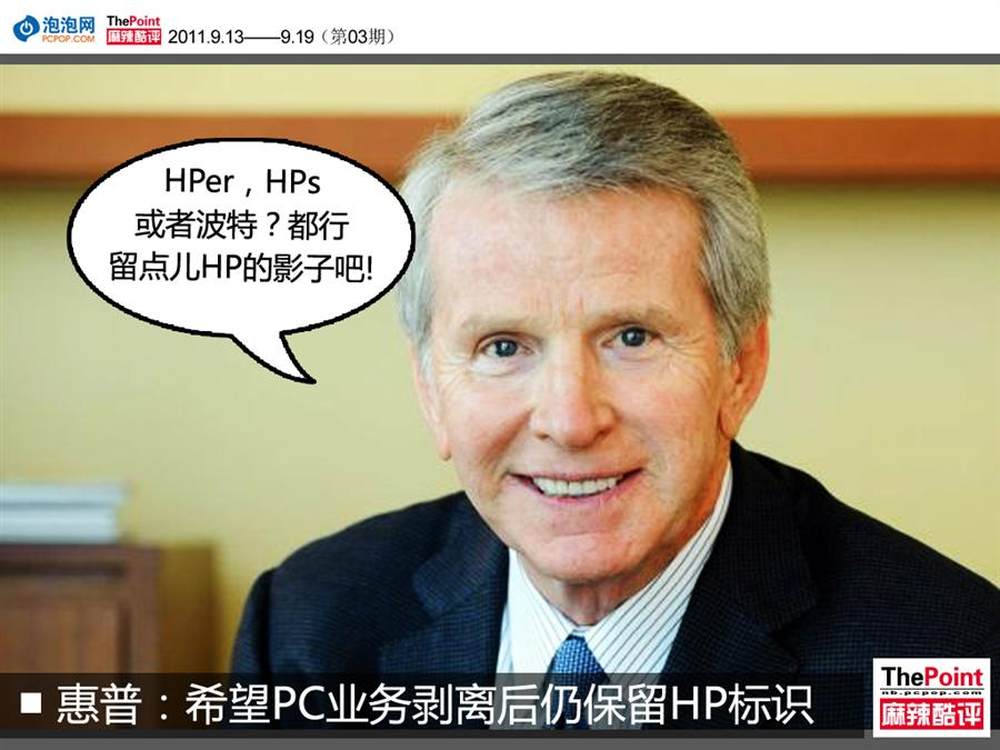 据国外媒体报道,惠普公司董事长雷·兰恩近日表示,仍希望在PC业务部门被分拆后继续包含“HP”标识。业内分析人士表示,惠普此举或为赢得投资者的支持。5/8