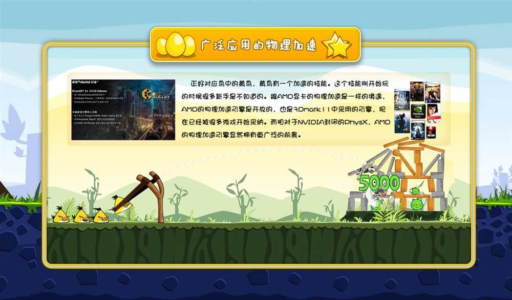 正好对应鸟中的黄鸟,黄鸟有一个加速的技能。这个技能刚开始玩的时候很多新手是不知道的。跟AMD显卡的物理加速是一样的境遇,AMD的物理加速引擎是开放的,也是3Dmark11中采用的引擎,现在已经被很多游戏开始采纳。而相对于NVIDIA封闭的PhysX,AMD的物理加速引擎显然拥有更广泛的前景。4/8