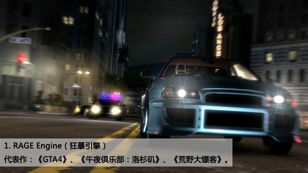 GTA3罪恶之城,San Andreas以及恶霸Bully并非使用的R星自己的技术,而是使用了Criterion的Renderware引擎(火爆狂飙好像也是这个吧,译注)。但由于GTA系列始终没有自己的引擎可用,R星的圣地亚哥工作室于2004年开始着手RAGE引擎的制作(RAGE全称Rockstar Advanced Game Engine),打算用在Red Dead Redemption中。根据IGN与R星的访谈中,R星称目前已经发售的3个使用了RAGE引擎的游戏(GTA4……)仅仅只是一次“热身”,真正的好戏还要看Red Dead Redemption。