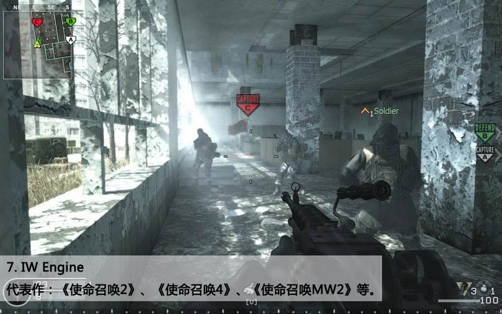 当然,IW指的就是Infinity Ward,本时代卖得最多的游戏系列背后的传奇制作组。最早的时候,游戏使用的是id Teck3引擎,在cod2代的时候,IW就在开发自己的插件,不过现在仍然没有命名。今年E3在IGN采访的时候,IW称现代战争2将采用IW 4.0引擎,据说会在很多方面胜过“现在仍然一点都没有过时的cod4”。
