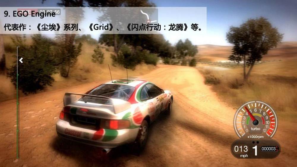 代码王这一代也算发了不少游戏了,说起他自家的游戏引擎,那也是相当有料的。就是因为很大程度上要说到的EGO引擎(正式一点的名字是NEON),而且这引擎还有索尼的一些技术支持。作为一款主打赛车游戏的引擎,EGO不仅能制作出高可玩性的各种不同的车体和路面效果,并且还能营造出精细的环境效果以及驾驶员的人性化表现,比如说碎裂的挡风玻璃……一个健全的动态损毁系统,精明的AI以及杰出的光照效果都使得EGO 所做出来的游戏非常吸引眼球。单子里还出现了闪点行动这个游戏,这足以说明这款引擎还是有很大弹性的,也可以制作那种非常真实的第一人称射击游戏。11/15