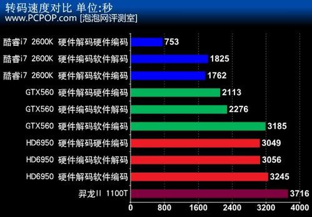 首先来看看性能方面,只看转码速度的话,Intel SandyBridge i7开启硬件编码解码后的速度超快,NVIDIA CUDA次之,AMD Stream慢一些。而不支持任何硬件编解码结束的AMD CPU垫底。17/18