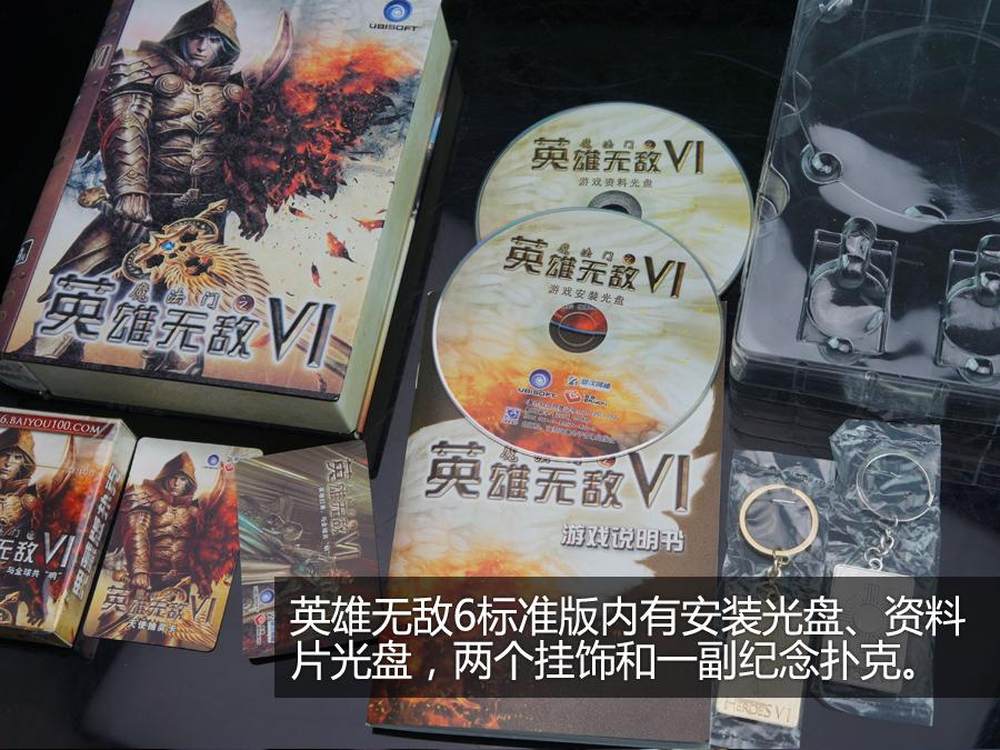 英雄无敌6标准版内有安装光盘、资料片光盘,两个挂饰和一副纪念扑克牌。6/26