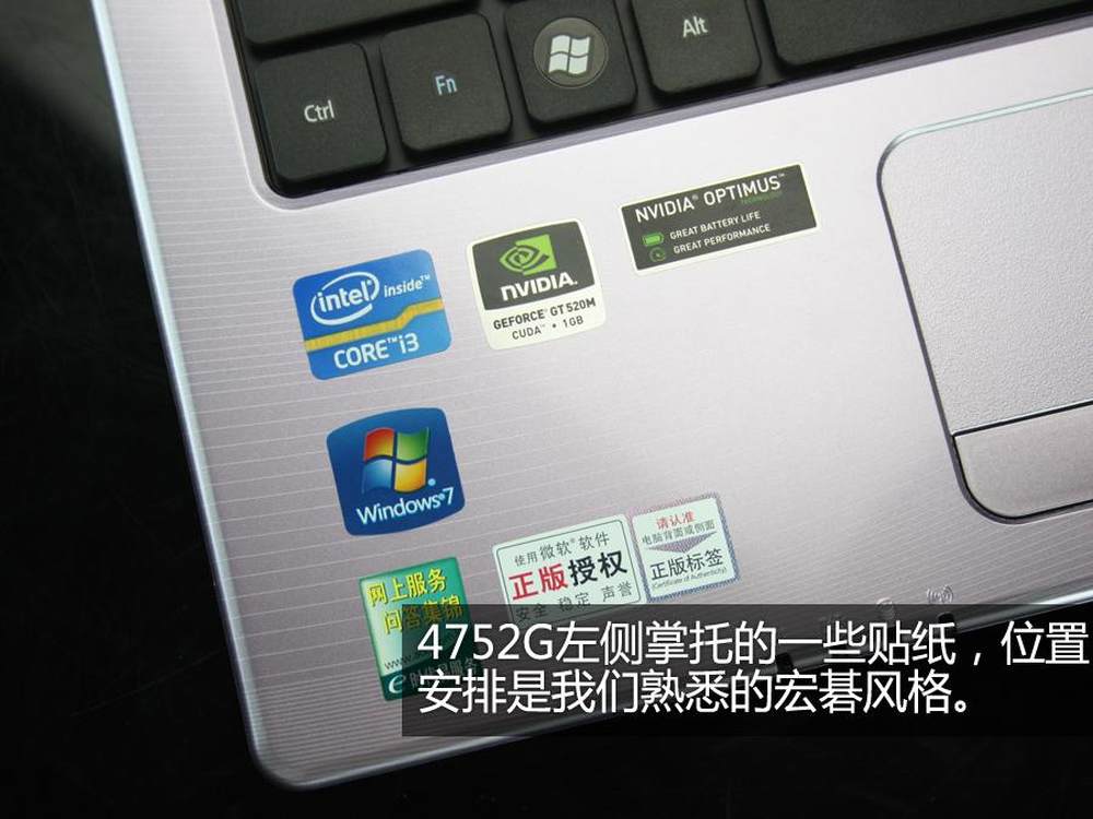 4752G左侧掌托的一些贴纸,位置安排是我们熟悉的宏碁风格。24/27
