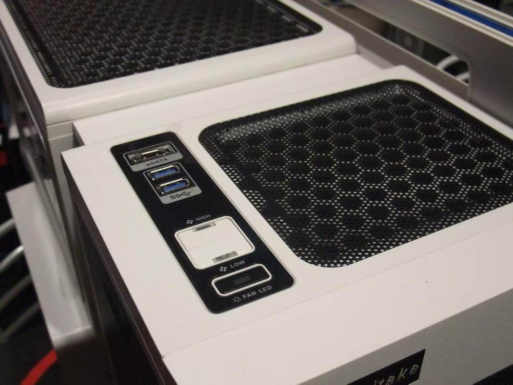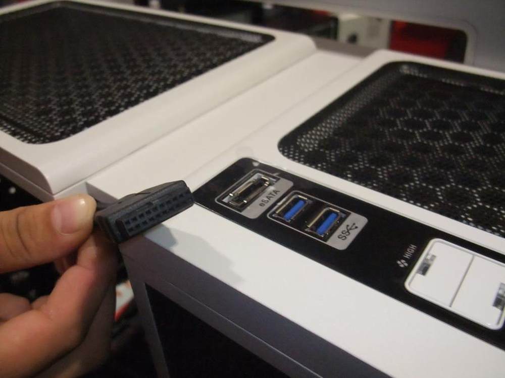 顶部还有一个区块,上面有两个USB3.0接口、一个E-SATA接口以及风扇调速与LED灯光控制按钮。小编认为这几个都是高端玩家经常会用到的功能,放在上面很方便。9/30
