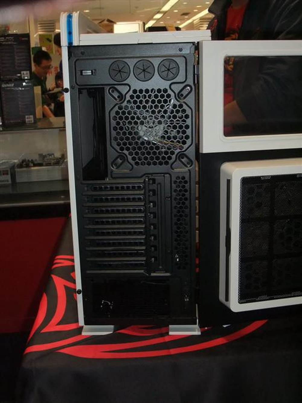 背面,从背面看它有八个PCI插槽,也就是说支持四块显卡SLI或CF,支持水冷散热器。21/30