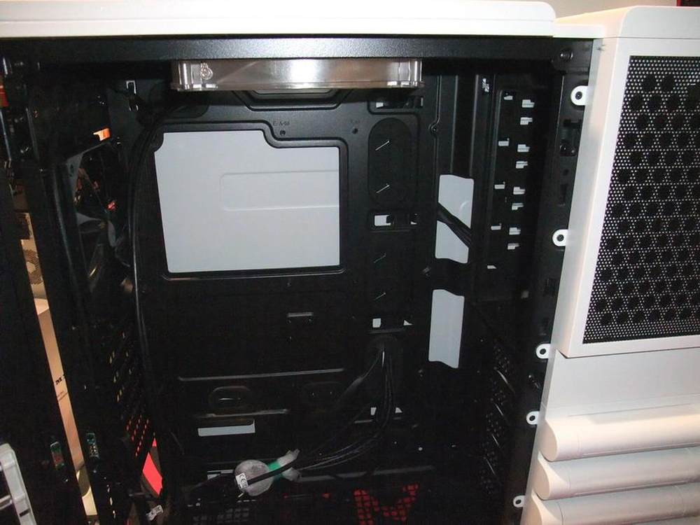 卸下面板之后的样子,前面的风扇和顶部以及侧板上的一样,就不重复介绍了。它的作用是吹硬盘,当然对机箱内部空气交换也有促进作用。24/30