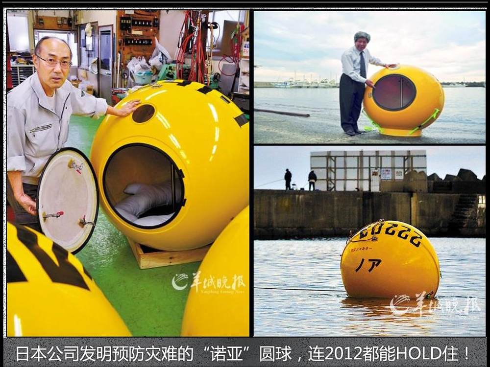 日本一家名为Cosmo Power的公司近日研发出一种可帮助使用者在地震和海啸中逃生的避难工具。这种圆形密封舱由强化玻璃纤维制成,能够在水上漂浮。发明者田中将其命名为“诺亚”,希望它能在下次地震和海啸中帮助人们逃生。(图片来源:羊城晚报)3/15