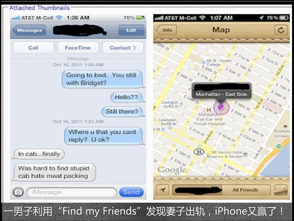 苹果发布iOS5的同时包含了“Find my Friends”功能,这个新的应用能让同意后的朋友持续分享未知数据,该功能已推出就遭到了隐私团体的质疑。悲剧的是,一名可怜的男人昨天在MacRumors论坛发帖称用这功能已经确认了自家妻子出轨。
