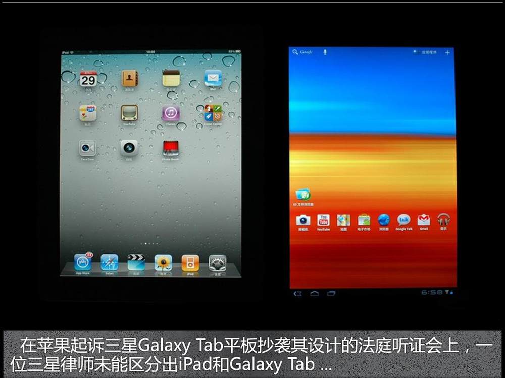 在苹果起诉三星Galaxy Tab平板抄袭其设计的法庭听证会上,一位三星律师未能区分出iPad和Galaxy Tab。美国地区法官Lucy Koh两只手分别举着Galaxy Tab 10.1和iPad,询问三星律师Kathleen Sullivan能否识别出三星产品。