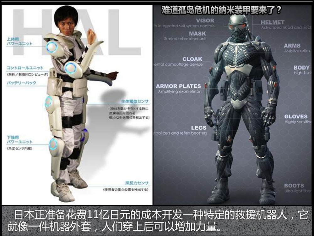 日本正准备花费11亿日元的成本开发一种特定的救援机器人,它就像一件机器外套,人们穿上后可以增加力量,包括从废墟中拯救受灾人员以及搜寻水下目标等。下面展示的是exoskeleton套装,也就是增强人力的机器人型号。目前日本是世界上机器人技术最强大的国家,2009年底的数据显示全球工业机器人的1/3来自日本,但他们缺少类似这种军事和救援级别的机器人。12/15