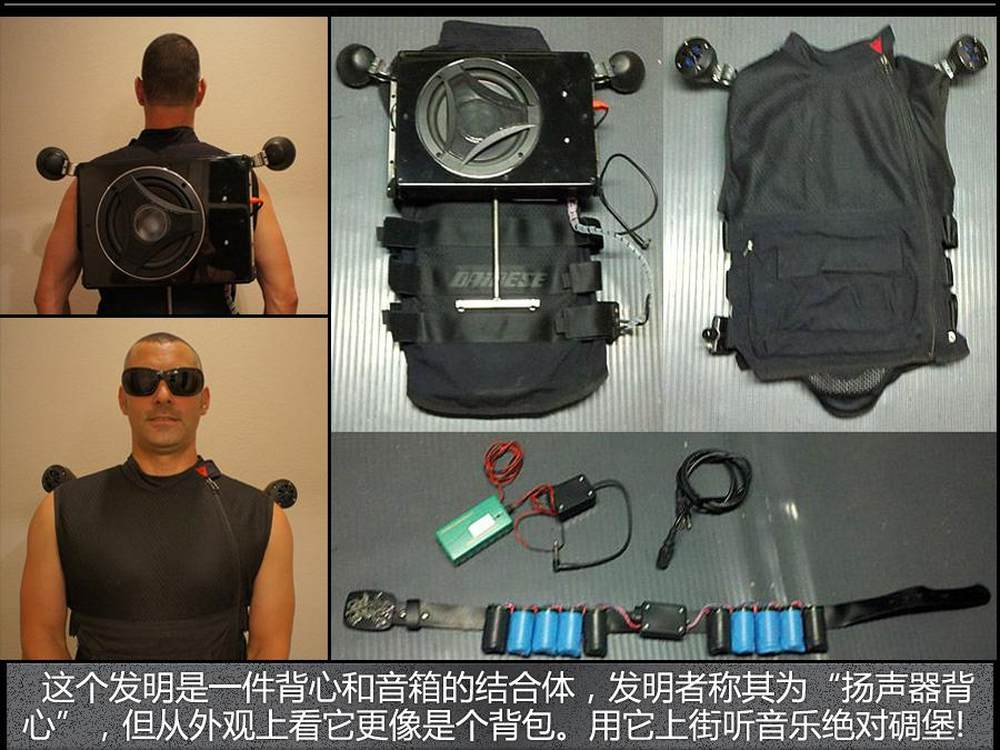 这个发明是一件背心和音箱的结合体,安多利纳称其为“扬声器背心”,但从外观上看它更像是个背包。安多利纳使用的是丹尼斯牌的背心,背后捆绑的是用在汽车上的Boss Bass900低音炮,背心的肩膀上方还冒出两个卫星式的音响系统。扬声器的供电系统是绑在一根皮带上的一颗可充电的10芯电池,只要你把MP3连到音箱上,你就可以边走边强迫路人享受你的音乐了。13/15